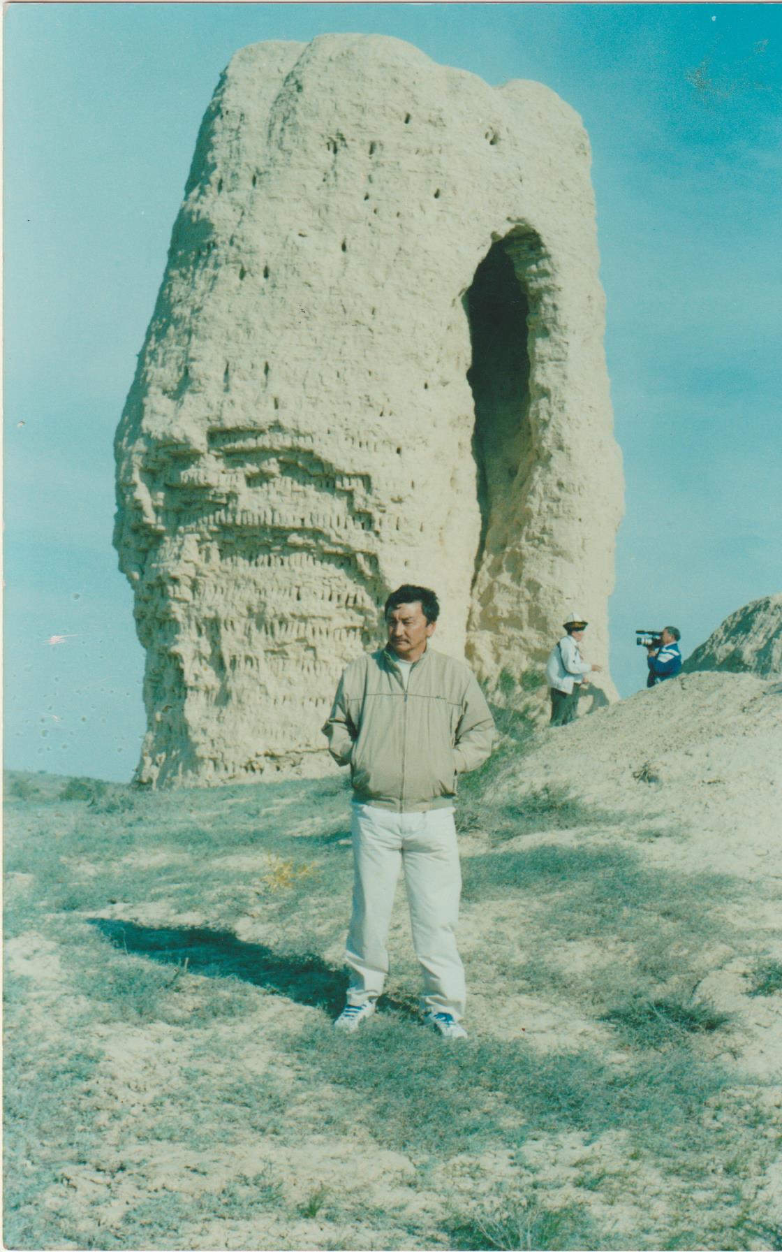 1-сурет: Ақкесене-2006 жыл, мамыр айы. Соңғы планда Қойшығара Салғара телевидениеге сұхбат беріп тұр.