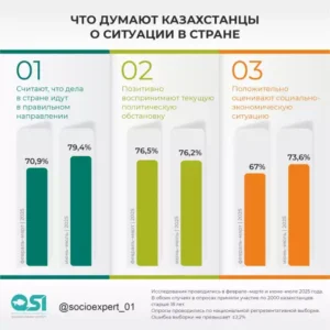 Маусым айындағы зерттеу ел дамуына қатысты бағалардың тұрақты екенін көрсетіп отыр. Бұл – таңдалған бағытқа қатысты қоғамда консенсус сақталып отырғанын және әлеуметтік көңіл-күйдің орнықты болып отырғанын көрсетеді. Респонденттердің басым бөлігі (79,4%) ел дұрыс бағытта дамып келе жатыр деп санайды.