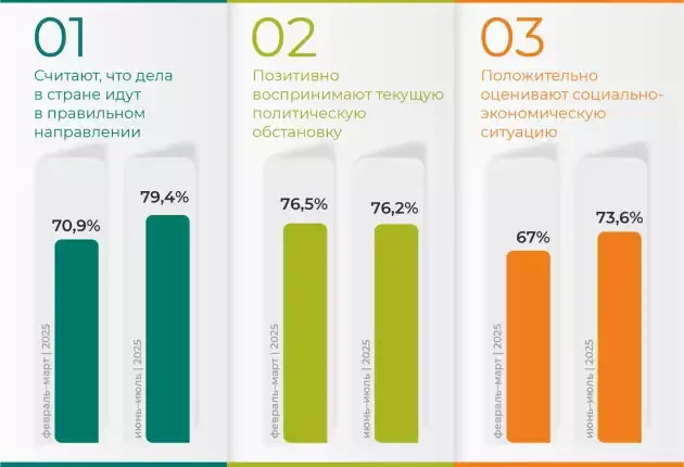 Маусым айындағы зерттеу ел дамуына қатысты бағалардың тұрақты екенін көрсетіп отыр. Бұл – таңдалған бағытқа қатысты қоғамда консенсус сақталып отырғанын және әлеуметтік көңіл-күйдің орнықты болып отырғанын көрсетеді. Респонденттердің басым бөлігі (79,4%) ел дұрыс бағытта дамып келе жатыр деп санайды.